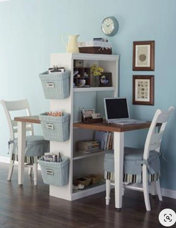 Also, I love this kid’s work station where more than one child can fit but it doesn’t take up tons of space. Creative thinking: All this consists of is a bookcase, a board, and 2 sets of legs! (bookcase creates a barrier - lol)